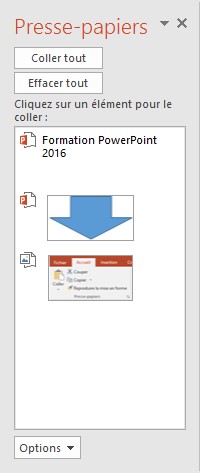 Les applications de la suite Office 2016 ont accès à un presse-papiers multiple contenant 24 entrées. Il est donc possible de couper ou de copier jusqu’à 24 éléments différents et de les coller comme bon vous semble dans vos présentations.