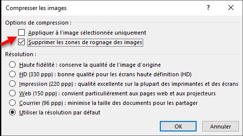 Cette action déclenche l’affichage de la boîte de dialogue Compresser les images. Il vous suffit maintenant de sélectionner une des options proposées sous Résolution puis de valider en cliquant sur OK.