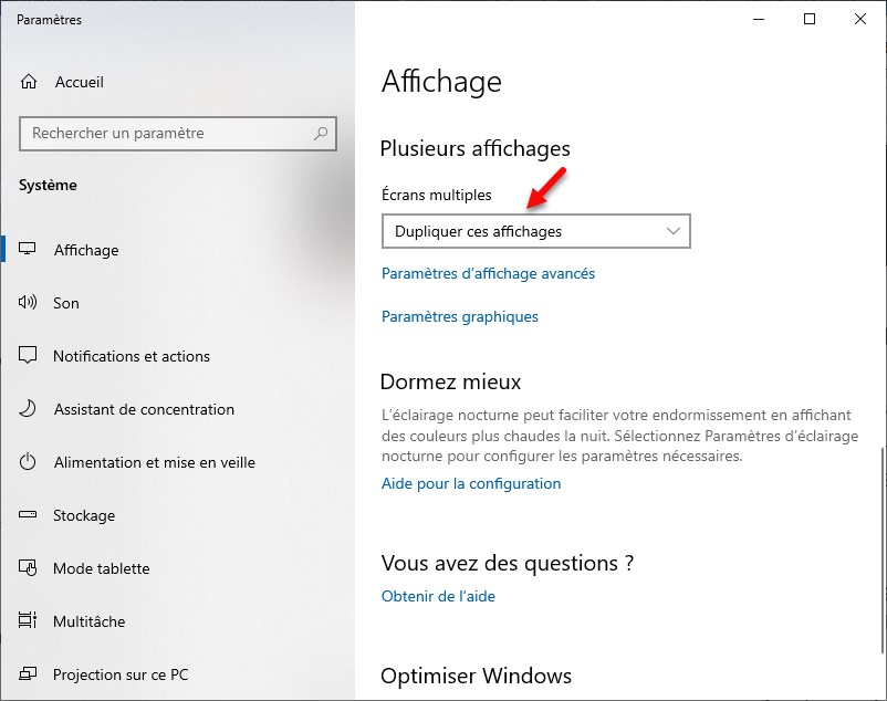 Si le mode Présentateur ne vous convient pas, vous pouvez cloner l’affichage de l’écran principal sur le vidéoprojecteur. Cliquez du bouton droit sur une partie inoccupée du Bureau et choisissez Paramètres d’affichage dans le menu. Sélectionnez Dupliquer ces affichages dans la liste Écrans multiples et fermez la boîte de dialogue des paramètres. Attention à ne pas dépasser la résolution maximale du vidéoprojecteur.
