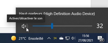 Cliquez sur l’icône haut-parleur dans la zone de notification, puis sur l’icône qui représente un haut-parleur dans la partie gauche de la barre de contrôle :