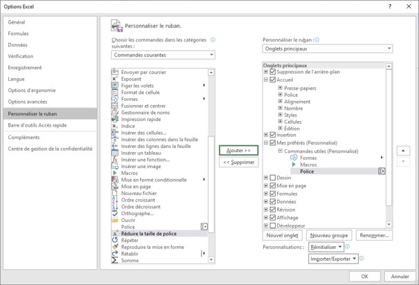 Supposons que vous vouliez insérer les icônes Formes, Macros et Police dans ce nouveau groupe. Sélectionnez Commandes courantes dans la première liste déroulante. Cliquez sur Formes puis sur Ajouter pour ajouter l’icône Formes dans l’onglet Mes préférés. Cliquez sur Macros puis sur Ajouter pour ajouter l’icône Macros dans l’onglet Mes préférés. Enfin, cliquez sur Police puis sur Ajouter pour ajouter l’icône Police dans l’onglet Mes préférés.