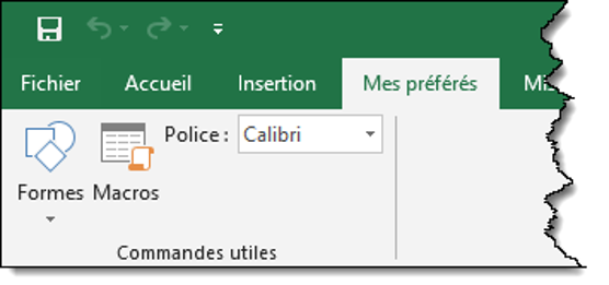 Ici, nous allons nous contenter des trois icônes qui ont été insérées dans l’onglet Mes préférés. Cliquez sur OK et savourez les possibilités offertes par votre nouvel onglet. Comme vous pouvez le voir, les icônes Formes, Macros et Police sont maintenant accessibles dans le groupe Commandes utiles de l’onglet Mes préférés du ruban :
