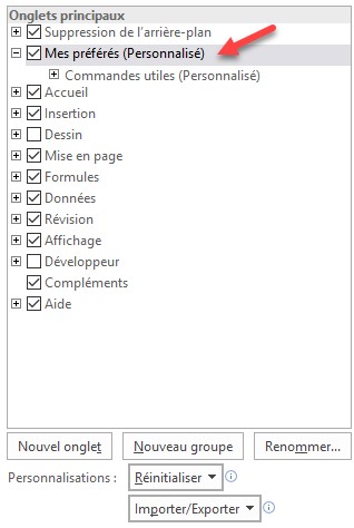 L’onglet que vous venez de créer peut être librement positionné dans le ruban. Pour cela, il suffit de le pointer dans la deuxième zone de liste et de le glisser-déposer à l’endroit souhaité. Ici par exemple, l’onglet Mes préférés est placé juste avant l’onglet Accueil. Il apparaitra donc entre les onglets Fichier et Accueil :