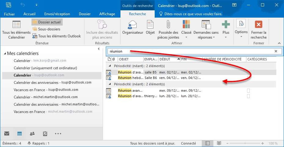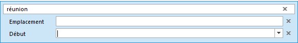 La zone de texte Rechercher Calendrier permet de trouver des informations textuelles dans un calendrier. Lorsque vous tapez un ou plusieurs mots dans la zone de recherche, l’affichage est filtré pour donner accès aux occurrences du terme recherché.