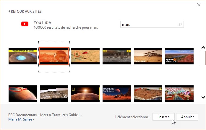 Entrez quelques mots dans la zone de texte Rechercher sur YouTube pour préciser la vidéo que vous recherchez puis appuyez sur la touche Entrée du clavier. Les résultats correspondants s’affichent sous la forme de vignettes. Cliquez sur l’une des vignettes puis sur Insérer pour insérer la vidéo dans le document :