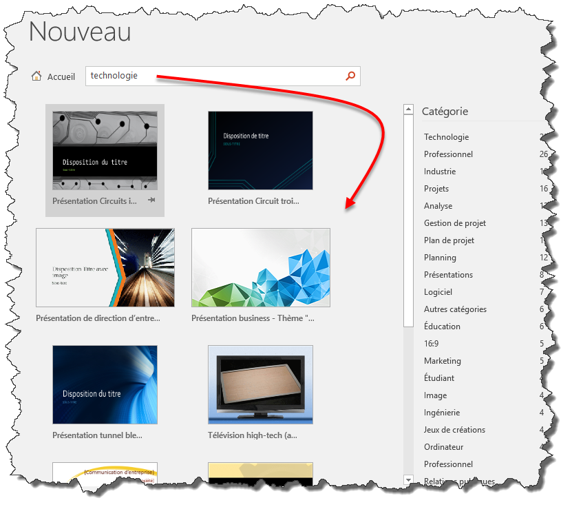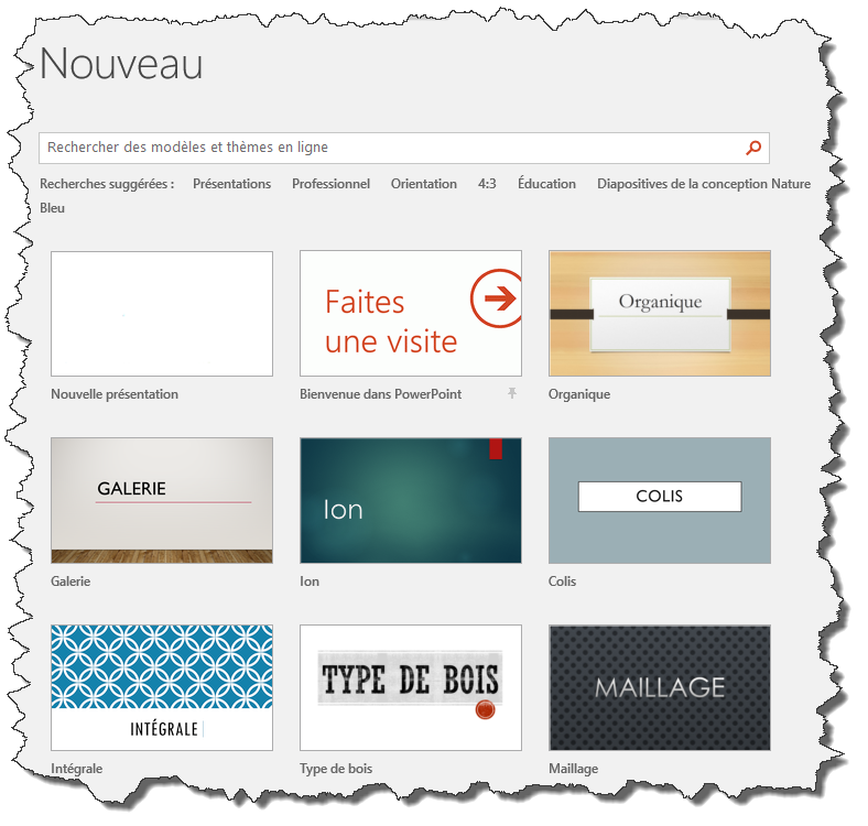Si les modèles proposés par défaut ne sont pas suffisants, vous pouvez accéder à des milliers de modèles complémentaires sur Office.com. Pour ce faire, basculez sur l’onglet Fichier dans le ruban, sélectionnez Nouveau dans la partie gauche de la fenêtre, tapez quelques mots dans la zone de texte Rechercher des modèles et thèmes en ligne et appuyez sur la touche Entrée du clavier. Quelques instants plus tard, les modèles correspondants apparaissent. Sélectionnez l’un d’entre eux, puis cliquez sur Créer.