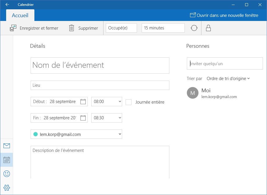 Définissez les détails de l’événement : son nom, son emplacement, ses heures de début et de fin, le calendrier dans lequel l’événement doit être enregistré (si vous avez relié plusieurs comptes email à l’application). Entrez quelques mots pour décrire l’événement.