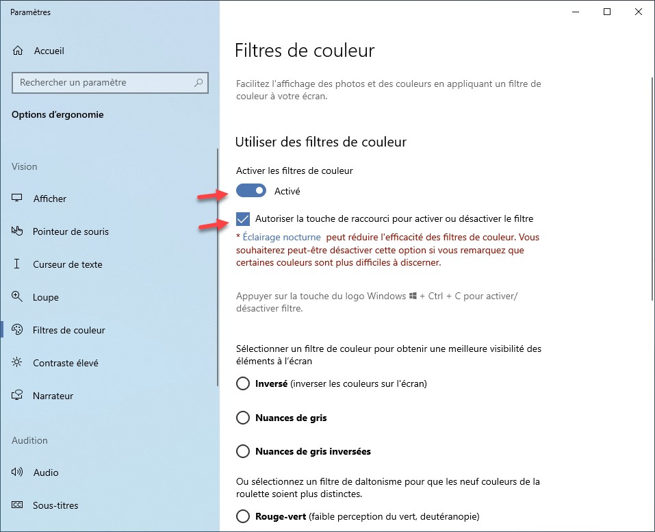 Cliquez sur Démarrer, tapez filtres et cliquez sur Activer ou désactiver les filtres de couleur dans la partie supérieure du menu Démarrer. La fenêtre Filtres de couleur s’affiche. Basculez l’interrupteur Activer les filtres de couleur en position Activé. Si vous le souhaitez, cochez la case Autoriser la touche de raccourci pour activer ou désactiver le filtre. Ainsi, vous pourrez appuyer sur Windows + Contrôle + C pour activer/désactiver le filtre de couleur :