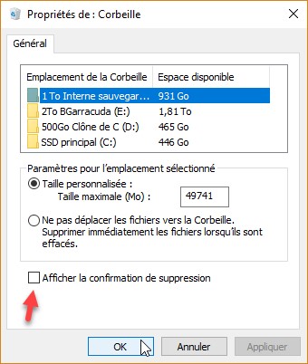 Cliquez du bouton droit sur l’icône de la corbeille, puis cliquez sur Propriétés dans le menu contextuel. La boîte de dialogue des propriétés de la corbeille s’affiche. Selon l’effet recherché, cochez ou décochez la case Afficher la confirmation de suppression, puis validez en cliquant sur OK :