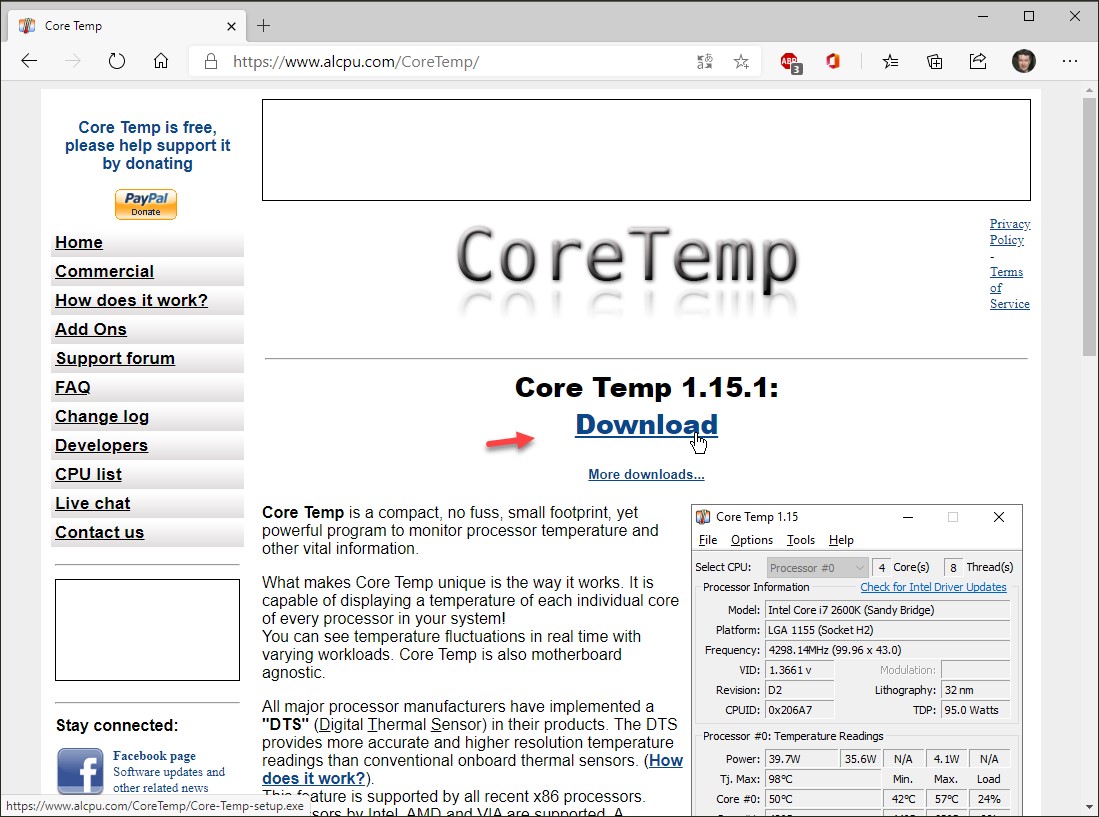 Connectez-vous sur la page https://www.alcpu.com/CoreTemp/ et cliquez sur le lien Download.