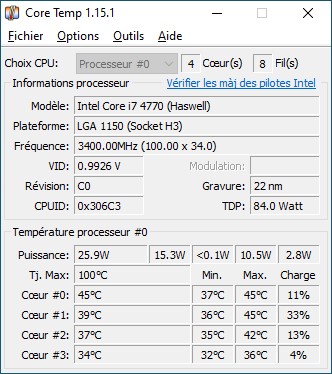 Il est important de vérifier de temps à autre la température du microprocesseur. S’il y a surchauffe, l’ordinateur peut se planter de façon aléatoire et vous pouvez perdre des données, voire même endommager vos unités de masse. Pour connaître la température du processeur, je vous propose d’utiliser l’application gratuite Core Temp.