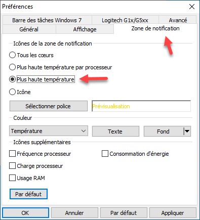 Pour limiter l’affichage dans la zone de notification à la température du cœur le plus chaud, lancez la commande Préférences dans le menu Options. La boîte de dialogue Préférences s’affiche. Basculez sur l’onglet Zone de notification et sélectionnez l’option Plus haute température sous Icônes de la zone de notification :
