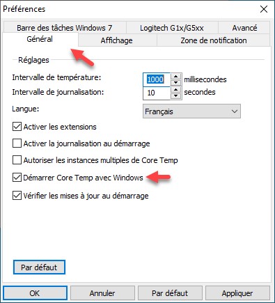 Basculez sur l’onglet Général et vérifiez que la case Démarrer Core Temp avec Windows est cochée. Ainsi, vous n’aurez pas à lancer Core Temp chaque fois que vous démarrez Windows :