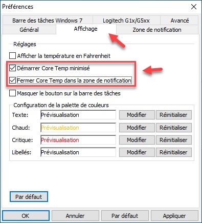 Pour terminer, basculez sur l’onglet Affichage et cochez les cases Démarrer Core Temp minimisé et Fermer Core Temp dans la zone de notification pour que la fenêtre de Core Temp ne soit pas visible sur le bureau :