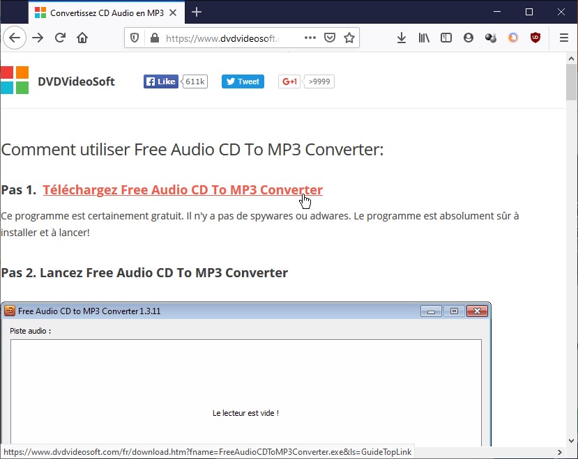 Allez sur la page https://www.dvdvideosoft.com/fr/guides/free-audio-cd-to-mp3-converter.htm et cliquez sur Téléchargez Free Audio CD To MP3 Converter :