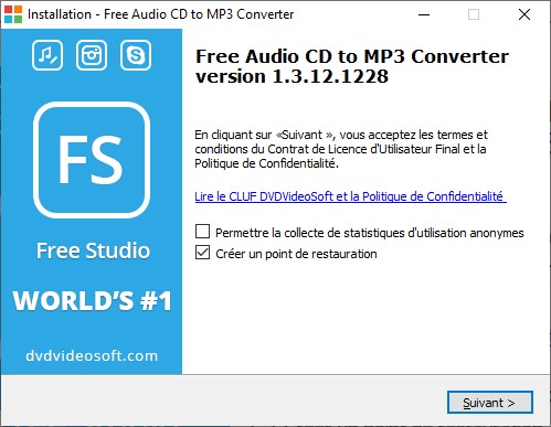 Une fois l’assistant d’installation de Free Audio CD To MP3 Converter téléchargé, exécutez-le. La deuxième boîte de dialogue vous propose de créer un point de restauration. Acceptez en cochant la case correspondante et suivez les instructions jusqu’à ce que l’application soit entièrement installée :