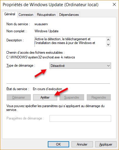 Double-cliquez sur l’entrée Windows Update. La boîte de dialogue des propriétés de Windows Update s’affiche. Déroulez la liste Type de démarrage et sélectionnez Désactivé. Cliquez également sur Arrêter pour arrêter le service Windows Update, qui doit théoriquement être en cours d’exécution :