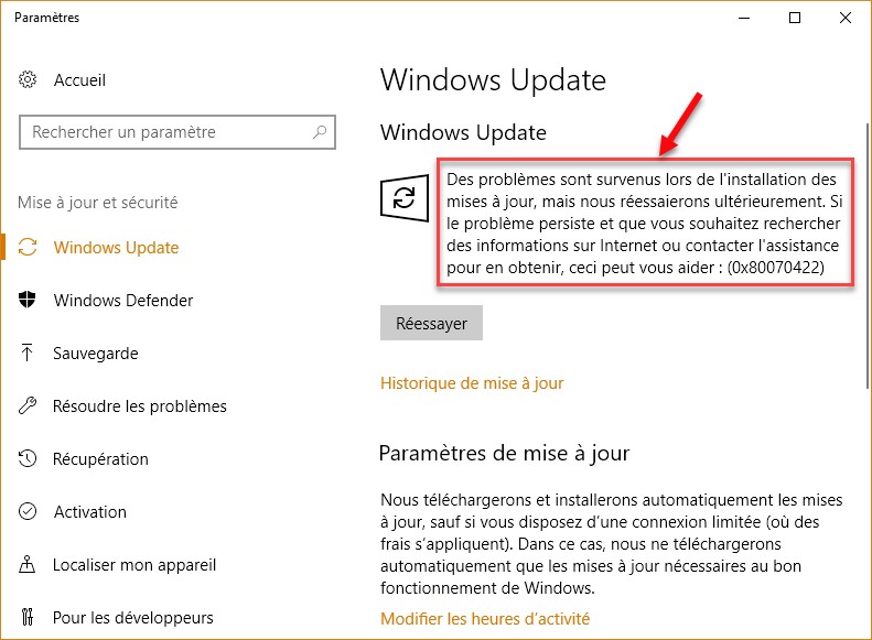 Vous allez vérifier que Windows Update est bien inopérant. Cliquez sur Démarrer, tapez update et cliquez sur Consulter les mises à jour dans la partie supérieure du menu Démarrer. La fenêtre Paramètres s’affiche, onglet Windows Update sélectionné. Cliquez sur Rechercher des mises à jour. Très rapidement, un message indiquera qu’un problème s’est produit pendant la recherche de mises à jour :