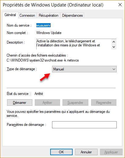 Une fois votre travail terminé, n’oubliez pas de restaurer le comportement par défaut de Windows Update. Il est en effet très important de mettre à jour régulièrement votre ordinateur pour (entre autres) combler les failles de sécurité qui apparaissent de temps en temps. Pour cela, il vous suffit de choisir Manuel, Automatique ou Automatique (début différé) dans la liste déroulante Type de démarrage et de valider en cliquant sur OK :