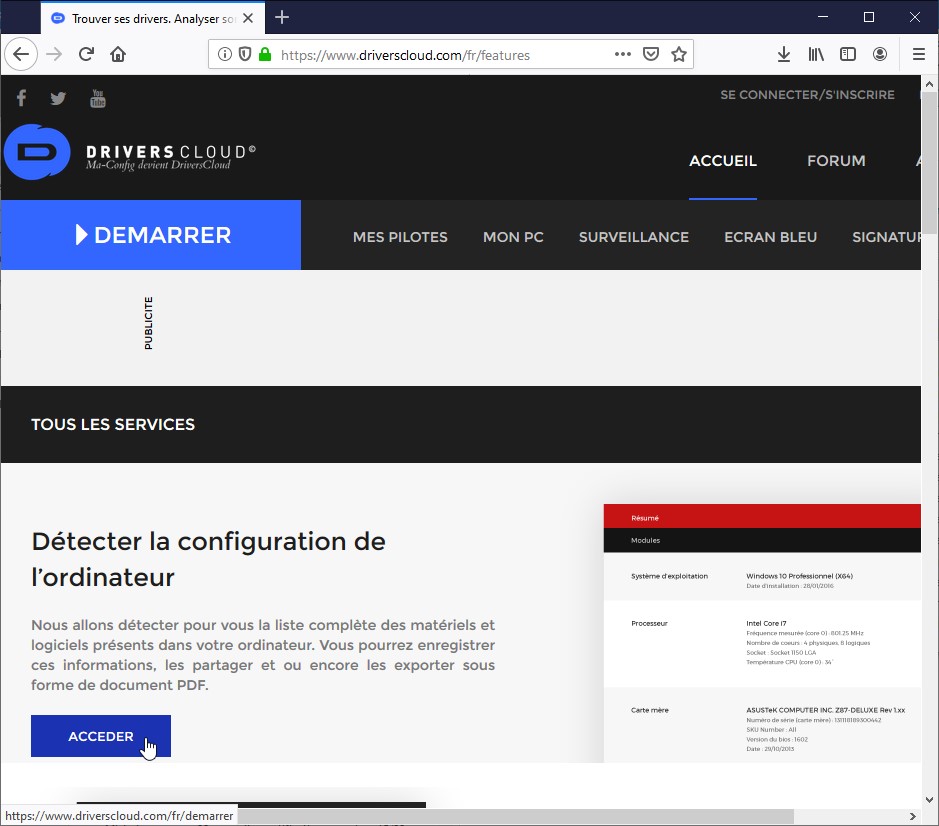 Connectez-vous sure la page https://www.driverscloud.com/fr/features et cliquez sur ACCEDER :