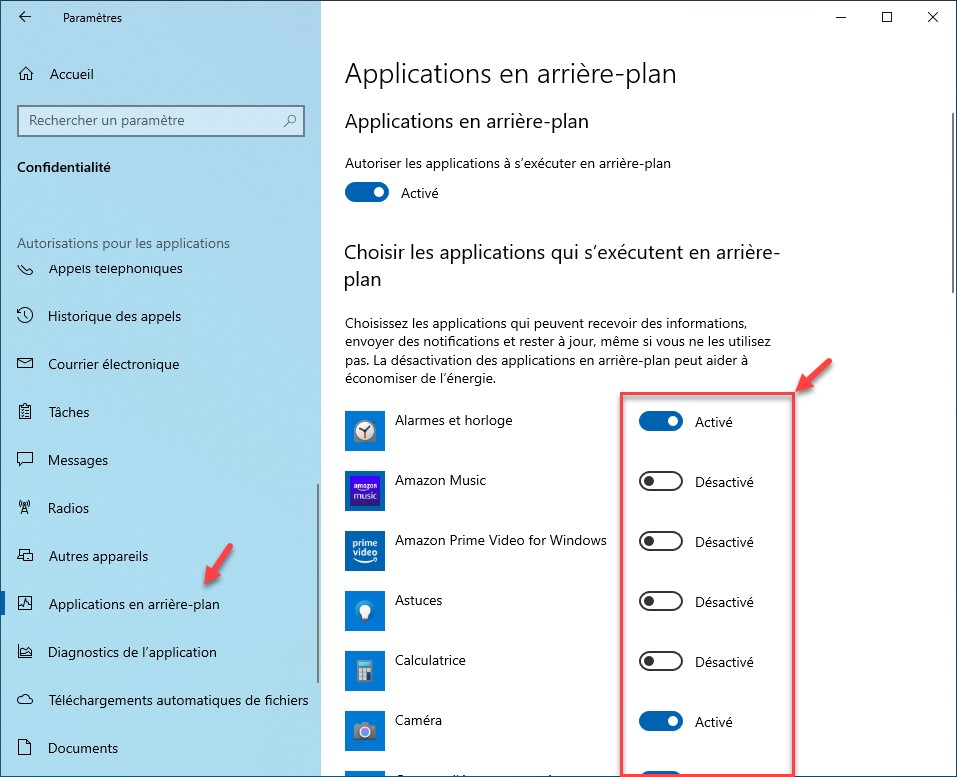 Cliquez sur Démarrer puis sur Paramètres. La fenêtre Paramètres Windows s’affiche. Cliquez sur l’icône Confidentialité, puis sélectionnez l’onglet Applications en arrière-plan dans le volet gauche. Les applications installées sur votre ordinateur s’affichent par ordre alphabétique. Agissez sur leur interrupteur pour autoriser (position Activé) ou interdire (position Désactivé) leur fonctionnement en arrière-plan :