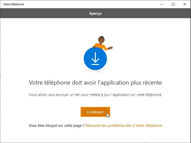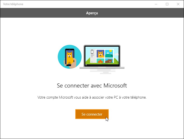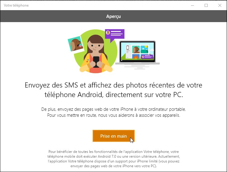 Pour accéder à cette application, cliquez sur Démarrer, tapez votre téléphone et cliquez sur Votre téléphone dans la partie supérieure du menu Démarrer. La fenêtre de l’application s’affiche. Cliquez sur Prise en main :