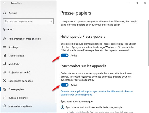 Cliquez sur Démarrer puis sur Paramètres. La fenêtre des paramètres s’affiche. Cliquez sur l’icône Système puis basculez sur l’onglet Presse-papiers. Activez les interrupteurs Historique du presse-papiers et Synchroniser sur les appareils :