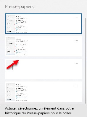 Pour accéder au contenu du presse-papiers sur tous les ordinateurs sur lesquels l’historique du presse-papiers et la synchronisation entre les appareils ont été activés, utilisez le raccourci clavier Windows + V et faites votre choix dans les éléments mémorisés :