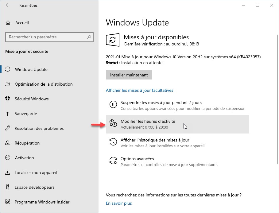 Pour que Windows ajuste automatiquement les heures d’activité en fonction de votre utilisation de l’ordinateur, cliquez sur Démarrer, tapez windows update et cliquez sur Paramètres de Windows Update dans la partie supérieure de l’écran. La fenêtre Windows Update s’affiche. Cliquez sur Modifier les heures d’activité :