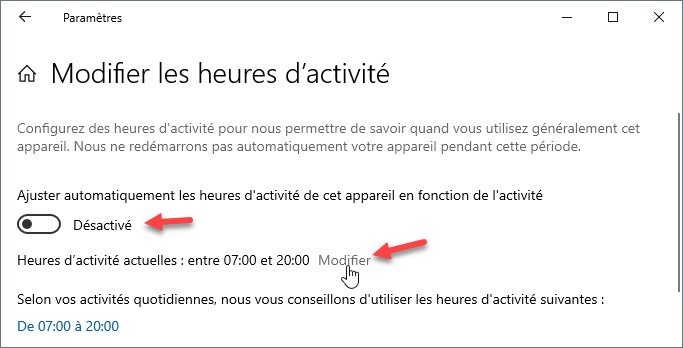 Placez l’interrupteur Ajuster automatiquement les heures d’activité de cet appareil en fonction de l’activité en position Désactivé, puis cliquez sur Modifier :