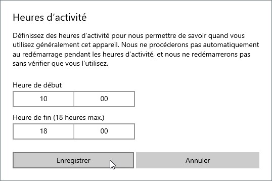Définissez vos heures d’activité dans la boîte de dialogue Heures d’activité, puis cliquez sur Enregistrer. Ici par exemple, les mises à jour ne seront pas effectuées entre 10 heures et 18 heures :