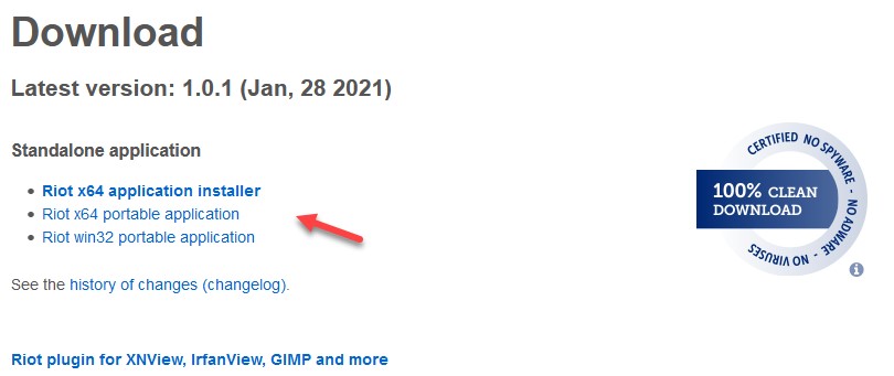 Rendez-vous sur la page https://riot-optimizer.com/download/ et téléchargez (par exemple) la version portable de l’application Riot en cliquant sur le lien Riot x64 portable application :