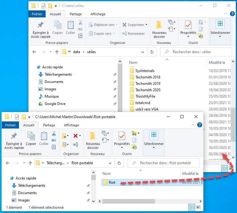 Le fichier Riot portable téléchargé est au format ZIP. Pour pouvoir utiliser l’application qu’il renferme, vous devez le déziper. Ouvrez l’explorateur de fichiers et rendez-vous dans le dossier Téléchargements. Cliquez avec le bouton droit de la souris sur le fichier Riot-portable.zip et cliquez sur Extraire tout dans le menu contextuel. Une boîte de dialogue s’affiche. Cliquez sur Extraire. Peu de temps après, une deuxième fenêtre de l’explorateur de fichiers s’affiche. Elle contient le dossier Riot. Déplacez ce dossier où bon vous semble : dans un dossier dédié aux utilitaires, sur une clé USB, etc.. Ici par exemple, le dossier est déplacé dans un autre dossier qui rassemble les programmes utilitaires dont je me sers tous les jours :