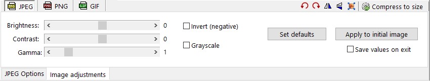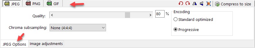 Les réglages propres à chaque format d’image sont disponibles dans la partie inférieure de la page, sous les onglets JPEG, PNG et GIF, lorsque JPEG/PNG/GIF Options est sélectionné dans la partie inférieure de la fenêtre :