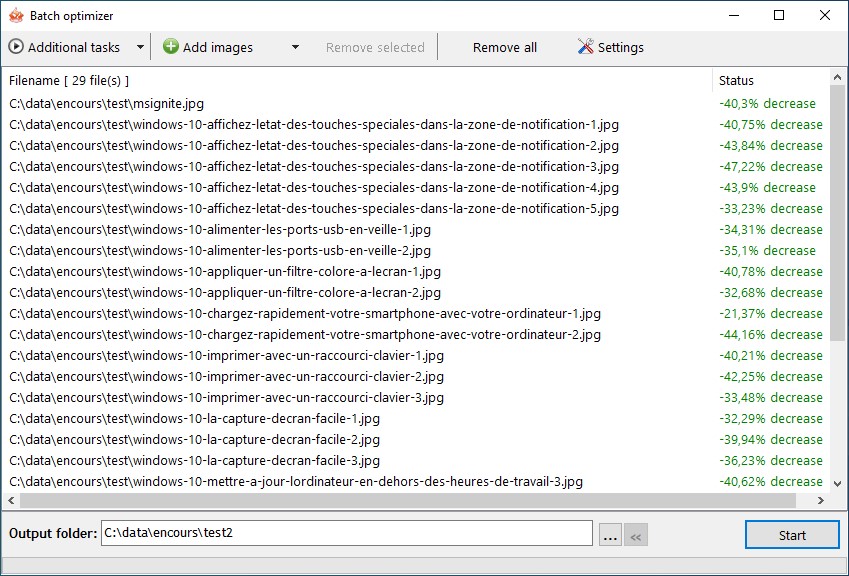 Cliquez sur le bouton Add images et désignez les images que vous voulez compresser. Cliquez alors sur Start pour lancer la compression batch. La diminution du poids des images s’affiche en face de chaque image traitée :