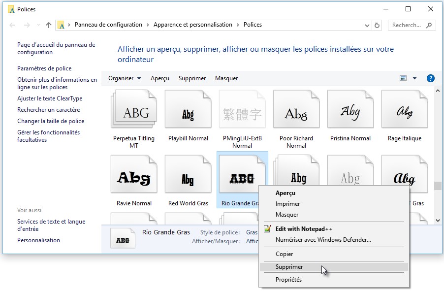 Cliquez sur Démarrer ou appuyez sur la touche Windows du clavier, tapez polices et cliquez sur Polices dans la partie supérieure du menu Démarrer. La fenêtre Polices s’affiche. Cliquez du bouton droit sur la police que vous voulez désinstaller et choisissez Supprimer dans le menu :