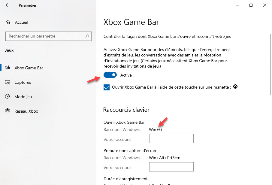 Si la barre jeu ne s’ouvre pas après que avoir appuyé sur les touches Windows et G, cliquez sur Démarrer puis sur Paramètres. La fenêtre Paramètres Windows s’affiche. Cliquez sur la vignette Jeux. Placez l’interrupteur en position Activé et assurez-vous que le raccourci pour ouvrir la barre jeu est bien Win+G :
