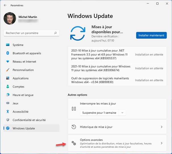 Appuyez simultanément sur les touches Windows et I. Dans la fenêtre des paramètres, sélectionnez l’onglet Windows Update, puis cliquez sur Options avancées :