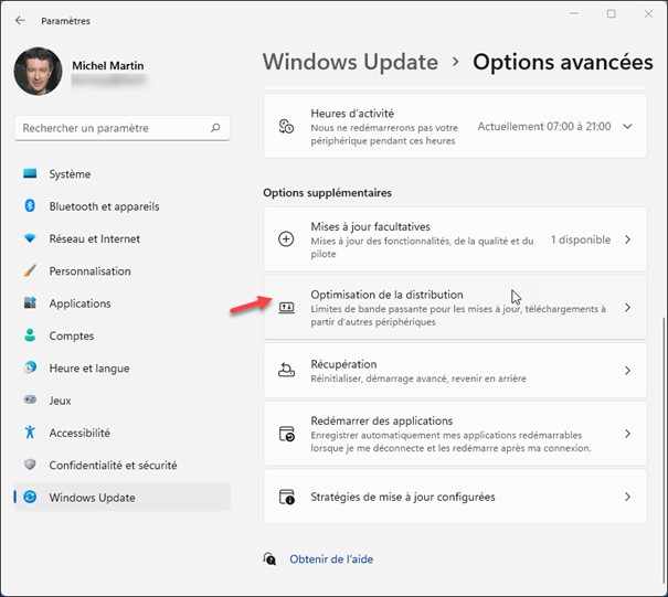 La fenêtre Windows Update/Options avancées s’affiche. Dans sa partie inférieure, cliquez sur Optimisation de la distribution :