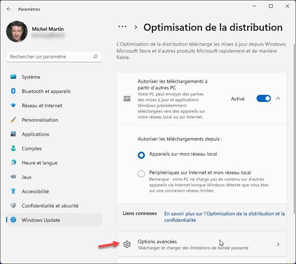 La fenêtre Windows Update/Options avancées/Optimisation de la distribution s’affiche. Cliquez sur Options avancées :