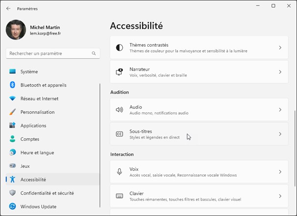 Appuyez simultanément sur les touches Windows et I pour afficher la fenêtre des paramètres de Windows. Sélectionnez l’onglet Accessibilité dans le volet gauche, puis cliquez sur Sous-titres, sous Audition :