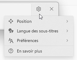 Dans la partie droite de la barre de sous-titrage, une icône en forme d’engrenage donne accès aux paramètres de l’application. Cliquez dessus pour définir la disposition de la barre de sous-titrage, la ou les langues reconnues et les préférences du sous-titrage (filtrage, inclusion de l’audio du microphone, styles des sous-titres) :