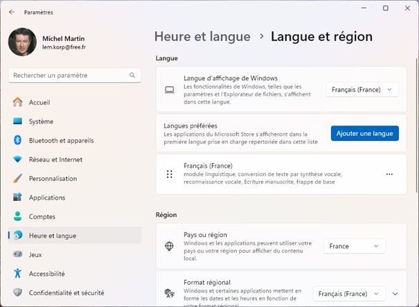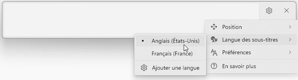 Par défaut, seule la langue du système est installée. Pour installer une autre langue, cliquez sur l’icône en forme d’engrenage, dans la partie droite de la barre de sous-titrage, pointez Langue des sous-titres, puis cliquez sur Ajouter une langue. La fenêtre de paramètres Heure et langue/Langue et région s’affiche :