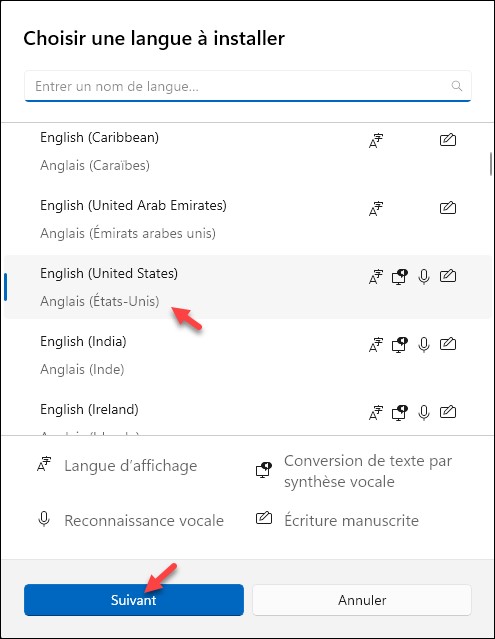 Cliquez sur Ajouter une langue. La boîte de dialogue Choisir une langue à installer s’affiche. Sélectionnez une langue qui prend en charge la reconnaissance vocale (cette information est indiquée dans la partie inférieure de la boîte de dialogue), puis cliquez sur Suivant :
