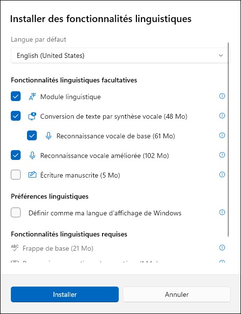 La boîte de dialogue Installer des fonctionnalités linguistiques s’affiche. Sous Fonctionnalités linguistiques facultatives, cochez les modules à installer. Assurez-vous que l’entrée Reconnaissance vocale améliorée est cochée, puis cliquez sur Installer :