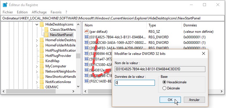 Développez tour à tour les dossiers suivants dans le volet gauche de l’éditeur du Registre : HKEY_LOCAL_MACHINE, Software, Microsoft, Windows, CurrentVersion, Explorer, HideDesktopIcons, puis NewStartPanel. Double-cliquez sur la clé {031E4825-7B94-4dc3-B131-E946B44C8DD5} dans le volet droit de l’éditeur du Registre et affectez-lui la valeur 0 :