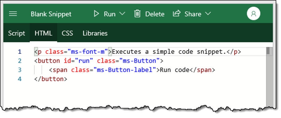Commençons par l’onglet HTML. Il contient les balises HTML de l’interface homme-machine (IHM) du snippet. C’est ce code qui s’affiche dans le volet Run lorsque vous cliquez sur l’icône Run du ruban. Dans cet exemple, l’interface comporte un texte dans un paragraphe (balise <p>)et un bouton (balise <button>) sont le label a été placé dans une balise <span> :