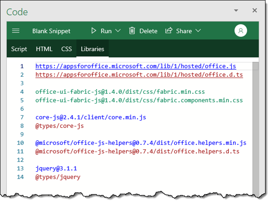 L’onglet Libraries fait référence aux bibliothèques JavaScript, TypeScript et jQuery utilisées par le snippet. Pour l’instant, vous n’aurez aucune action dans cet onglet :