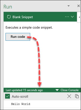 Pour exécuter ce premier snippet, cliquez sur l’icône Run de l’onglet Script Lab du ruban. Le volet Run s’affiche à droite du volet Code. Cliquez sur le bouton Run Code. Le résultat s’affiche dans la console :