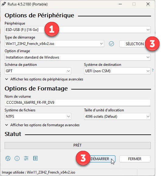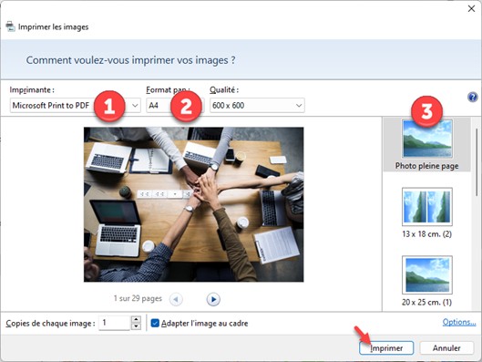 La boîte de dialogue Imprimer les images s’affiche. Sélectionnez Microsoft Print to PDF (1) dans la liste déroulante Imprimante. Choisissez un format de papier dans la liste déroulante Format (2) et une mise en page dans la zone de liste de droite (3), puis cliquez sur Imprimer :